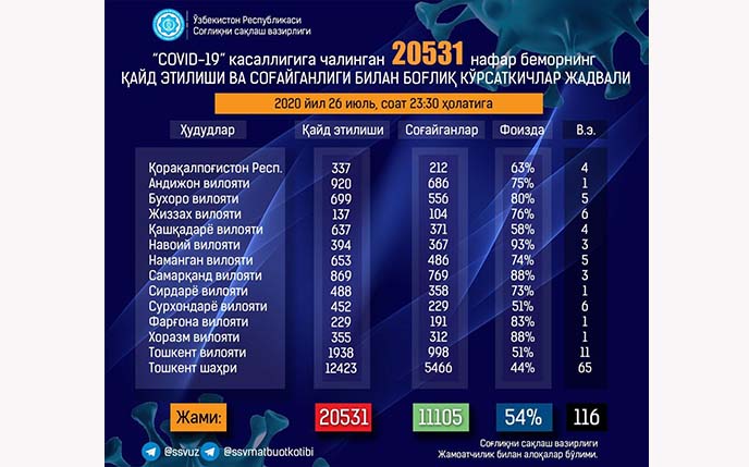 26 июля было зарегистрировано 579 новых случаев коронавирусной инфекции и все они — среди граждан, контактировавших с больными коронавирусной инфекцией, или у кого тестирование проводили по первичным признакам Covid-19.