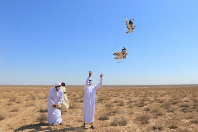 Акция проведена Госкомэкологии, Эмиратским центром по сохранению дрофы-красотки и компанией Falcon Hunting Solutions.