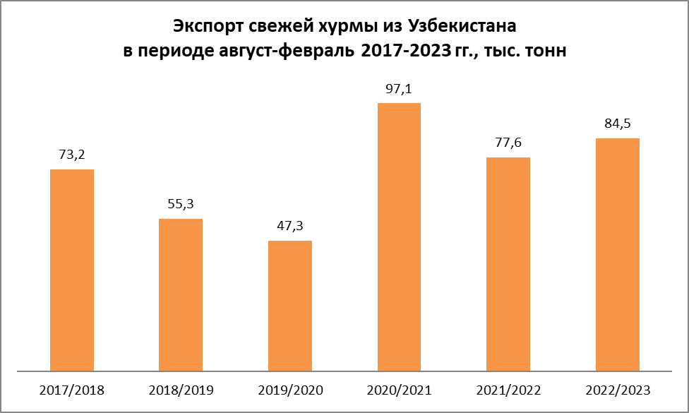 Диаграмма показывает, что резкое снижение экспорта свежей хурмы из Узбекистана наблюдалось в 2018/2019 и 2019/2020 годы. Однако после этого экспорт начал расти и уже третий сезон подряд оказывается больше 77 тысяч тонн.