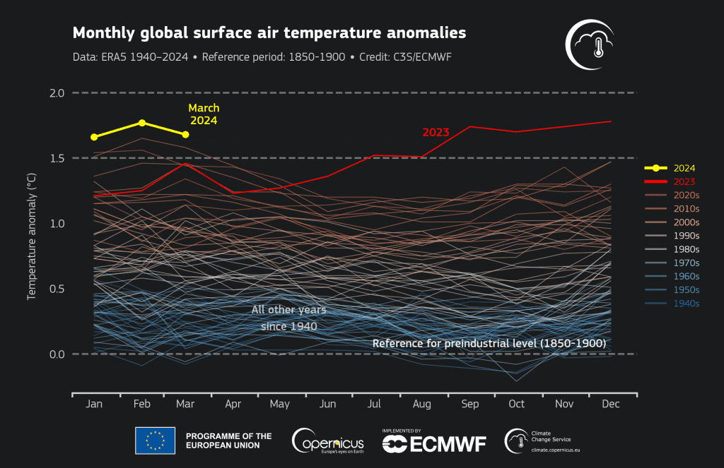 Температура марта 2024 года оказалась на 1,68°C выше среднего для марта в период с 1850 по 1900 годы, который считается доиндустриальным эталонным периодом.