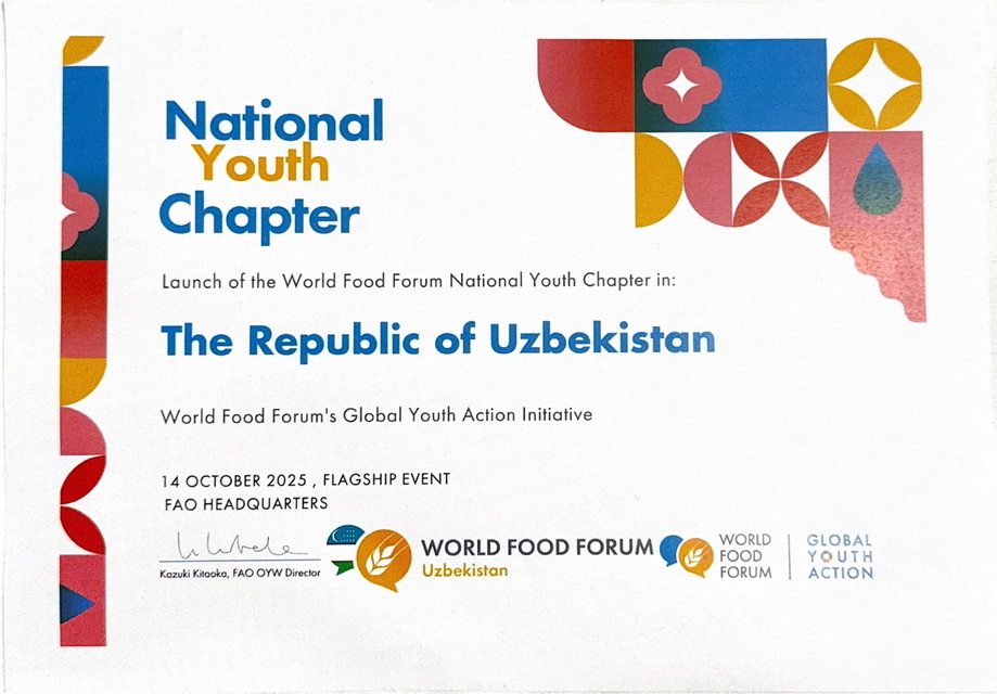 В штаб-квартире Продовольственной и сельскохозяйственной организации ООН (ФАО) в Риме, Италия, в рамках Всемирного продовольственного форума (World Food Forum — WFF) официально объявлено о создании молодёжного отделения WFF Узбекистана (WFF Uzbekistan National Youth Chapter). В честь этого события участникам были торжественно вручены сертификаты о начале деятельности отделения.