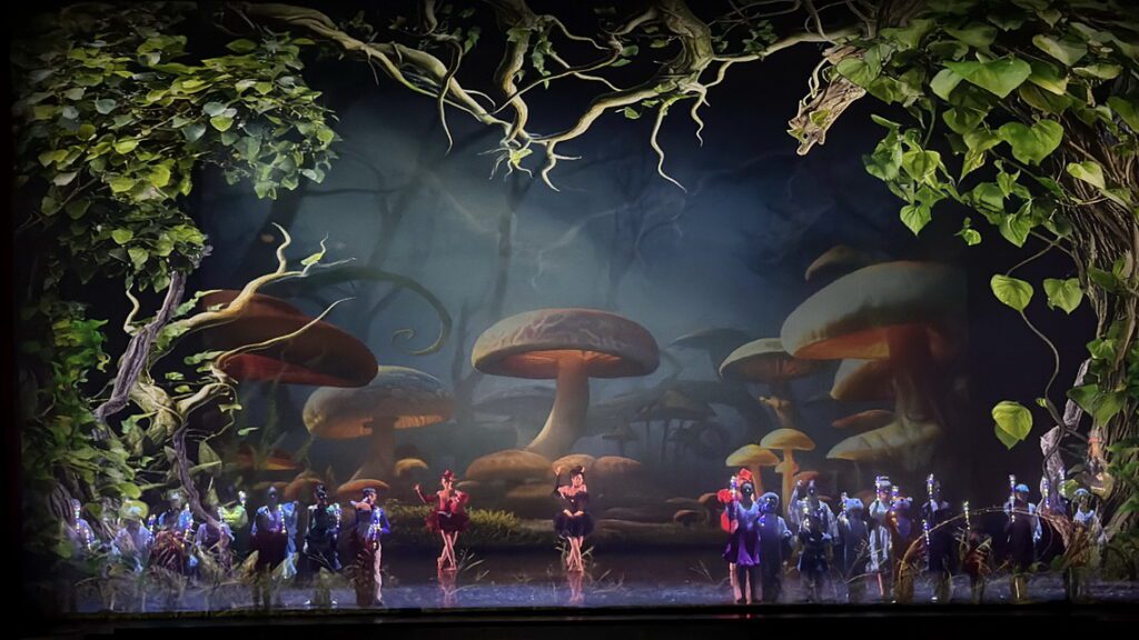 На сцене царит настоящее волшебство: декорации переносят зрителей от уютного сада к фантастическим лабиринтам с гигантскими цветами, карточными солдатами и иллюзиями роста и уменьшения. Костюмы яркие, фантазийные — от пушистых кроличьих ушек до пышных платьев Королевы. Танцы сочетают классическую технику с современными акцентами: грациозные вариации Алисы, комичные групповые сцены на чаепитии и динамичные па-де-де. Хореография выстроена в едином сказочном контексте, где каждый эпизод плавно перетекает в следующий, создавая ощущение непрерывного погружения в мир чудес — от лёгких, воздушных соло до энергичных массовых номеров.