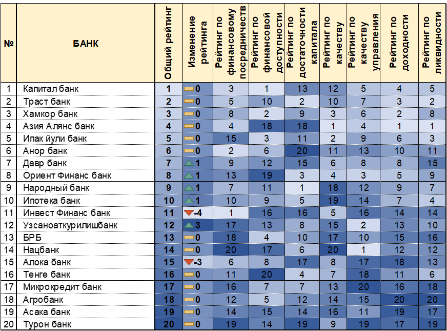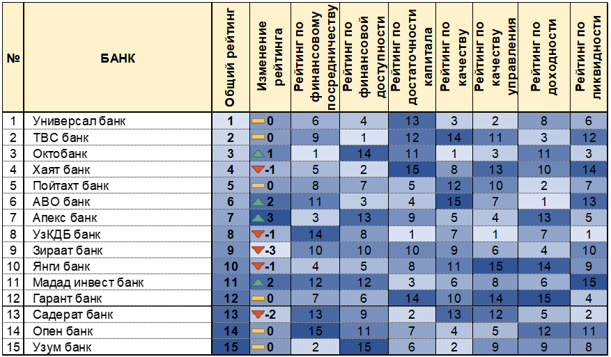Наиболее заметный прогресс показал «Узпромстройбанк», поднявшийся на 3 позиции. Позитивную динамику также продемонстрировали «Давр банк», «Ориент финанс банк», «Халк банк» и «Ипотека банк», улучшив свои позиции в общем рейтинге.