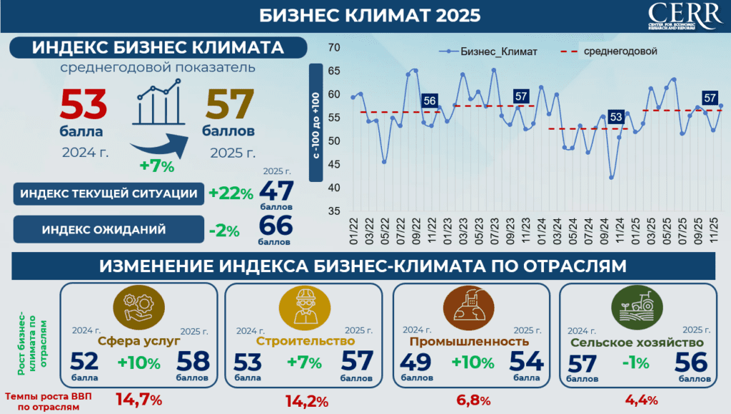 В разрезе отраслей в 2025 году отмечено улучшение бизнес-климата в большинстве секторов экономики. В сфере услуг индекс составил 58 пунктов с ростом на 14,7%; в строительстве – 57 пункта (+14,2%), в промышленности – 54 пункта (+6,8%).
