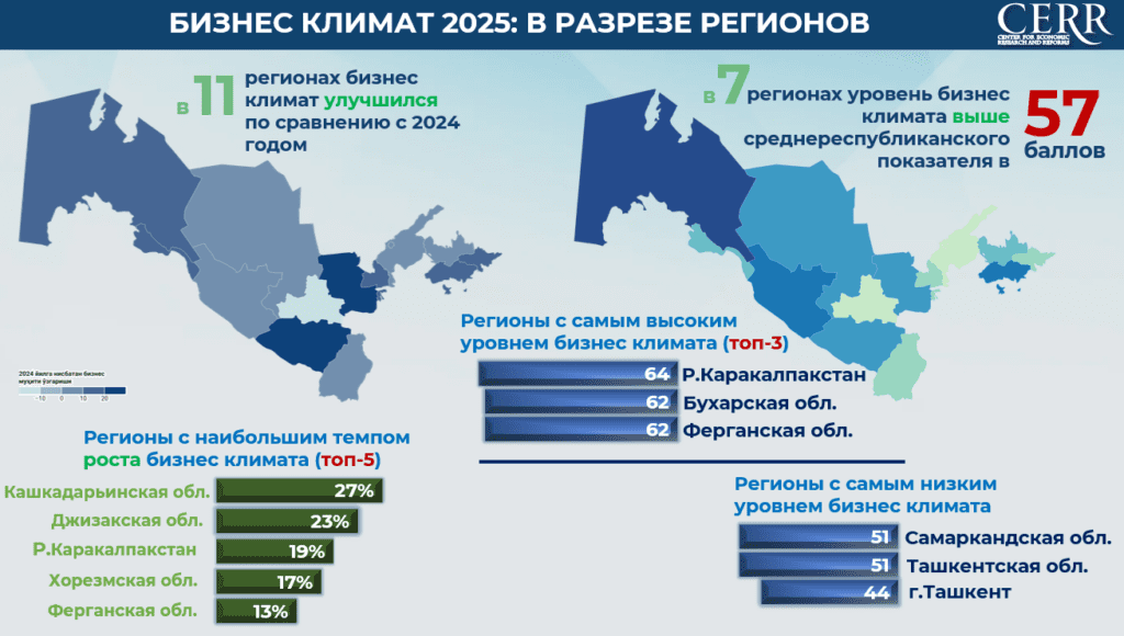 Наиболее заметное улучшение бизнес-климата по итогам года отмечено в Кашкадарьинской области, где показатель увеличился на 27%, в Джизакской – на 23% и в Хорезмской областях – на 17%. В Республике Каракалпакстан рост составил 19%.
