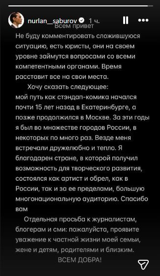 Стендак-комик Нурлан Сабуров сделал первое публичное заявление после того, как СМИ сообщили о наложенном на него запрете на въезд в Россию.
