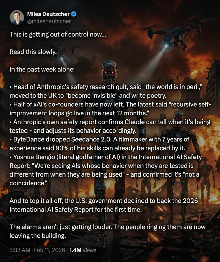 · Уже ровно половина основателей xAI покинула компанию. Последний заявил, что «в ближайший год будут запущены циклы рекурсивного самосовершенствования»