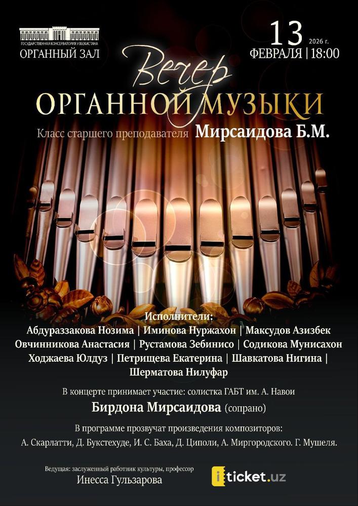 История органа насчитывает более двух тысяч лет. Он известен своим огромным диапазоном звучания и уникальной акустической мощью. Орган может создавать как торжественные и величественные звуки, так и нежные и душевные мелодии. А такие композиторы как Иоганн Себастьян Бах, Георг Фридрих Гендель, Дитрих Букстехуде и многие другие писали для него произведения, которые и сегодня исполняются в концертах. Не был исключением и прошедший «Вечер органной музыки», в котором успешно выступили: Азизбек Максудов, Зебинисо Рустамова, Нигина Шавкатова, Екатерина Петрищева, Нилуфар Шерматова, Юлдуз Ходжаева, Муниса Содикова, Назима Абдуразакова, Анастасия Овчинникова, Нуржахон Иминова. В концерте также приняла участие солистка Государственного академического Большого театра имени А. Навои, лауреат международных конкурсов Бирдона Мирсаидова, чей красивый, мягкий голос, сдержанную и эмоциональную манеру исполнения слушатели оценили по достоинству.