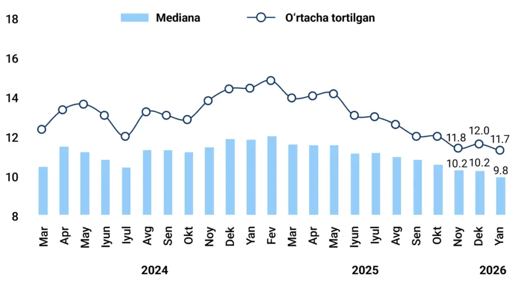 В январе уровень личной инфляции населения Узбекистана снизился до 11,7%, сообщает Центральный банк.