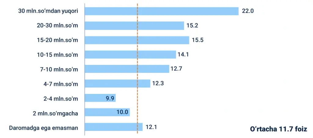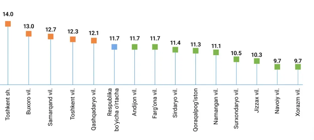 Среди регионов самый высокий показатель зафиксирован в Ташкенте — 14%, почти вдвое выше официальной годовой инфляции (7,2%). Далее идут Бухарская (13%) и Самаркандская области (12,7%). Наименьший уровень — в Хорезмской области (9,7%).