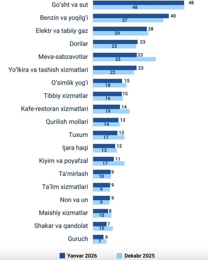 Главными драйверами роста цен жители назвали мясо и молочные продукты (48% опрошенных), бензин и топливо (40%), электроэнергию и газ (28%), а также лекарства (23%). Реже всего дорожали рис, сахар, кондитерские изделия и бытовые услуги.
