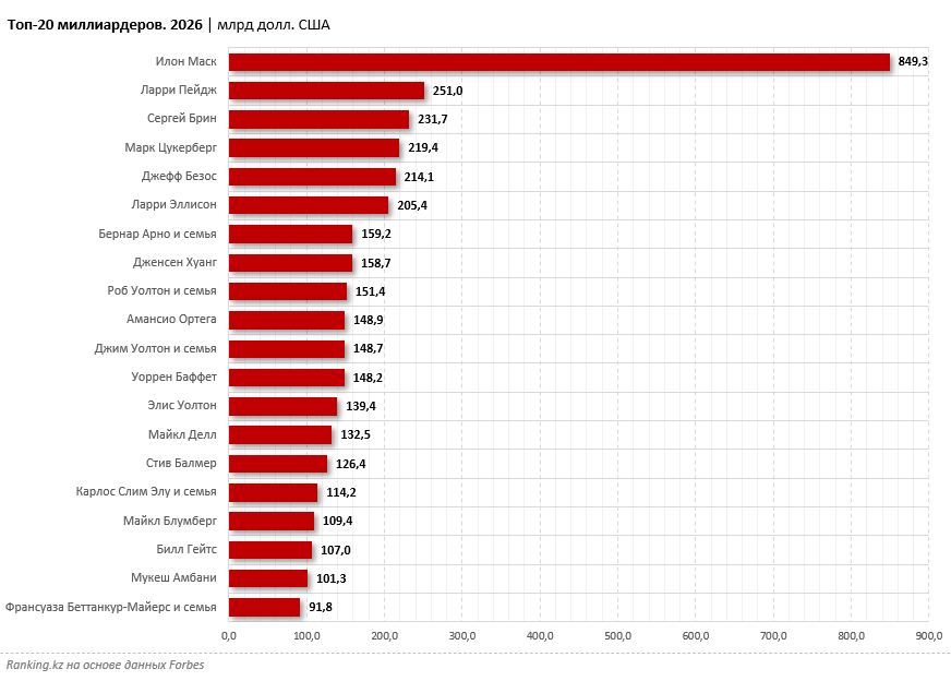Совокупное состояние богатейших людей планеты, по данным Forbes, в 2026 году почти достигло 19 трлн долл. США. При этом 76% всего капитала миллиардеров сосредоточено всего в 10 странах и территориях, а лидер рейтинга вплотную приблизился к отметке в 1 трлн долл. США.