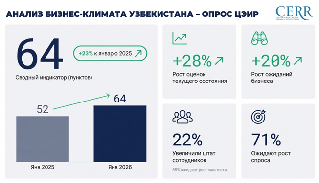 В январе текущего года сводный Индекс бизнес-климата Узбекистана составил 64 пункта (по шкале от −100 до +100), что на 23% выше уровня 2025 года.