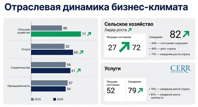 В сельском хозяйстве значение бизнес-климата выросло на 62% относительно аналогичного периода прошлого года и составило 77 пунктов, против 48-ми пунктов в январе 2025 года.