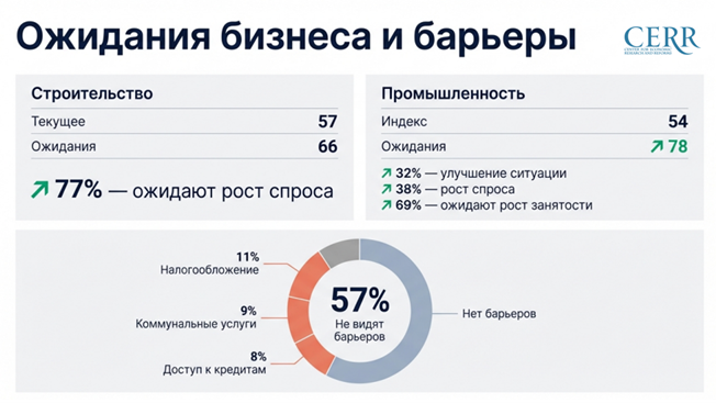 При этом оптимизм предприятий в промышленности остается устойчиво высоким. В январе ожидания выросли на 10%, достигнув 78 пунктов, что указывает на сохранение позитивного отношения касательно перспектив развития.