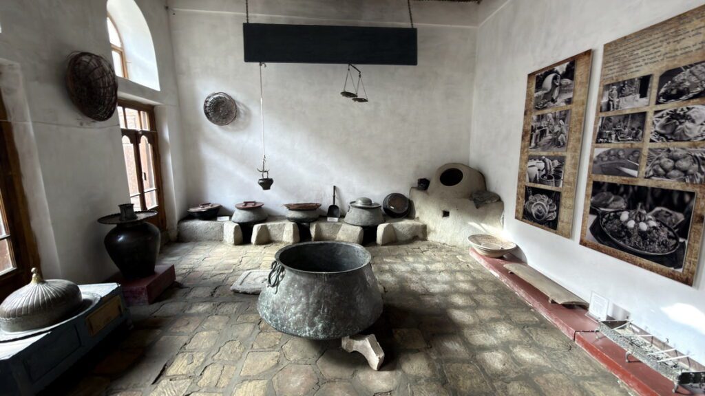 Интерьеры восстановлены бережно. Потолки с резьбой, стены с тонкой лепниной, ковры, сюзане, витрины с посудой и утварью. Вход — без обуви. Это сразу задаёт интонацию.