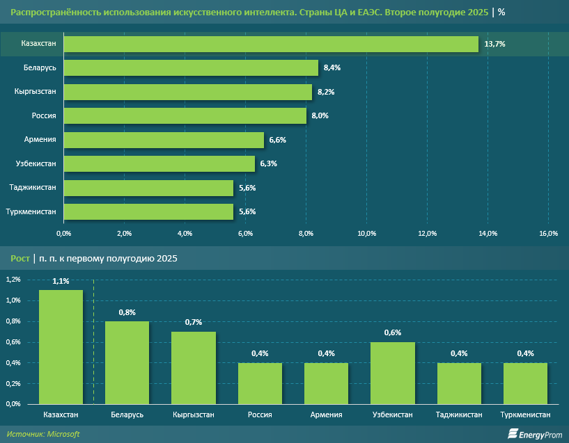 Среди стран Центральной Азии и Евразийского экономического союза наблюдается собственная внутренняя иерархия по распространённости использования искусственного интеллекта. Казахстан значительно опередил остальные государства ЦА и ЕАЭС. Для сравнения: в РК распространённость использования ИИ среди трудоспособного населения во втором полугодии 2025-го составила 13,7%. Следом со значительным отставанием идут Беларусь (8,4%), Кыргызстан (8,2%) и Россия (8%), где лишь чуть более 8% трудоспособного населения используют генеративный ИИ.