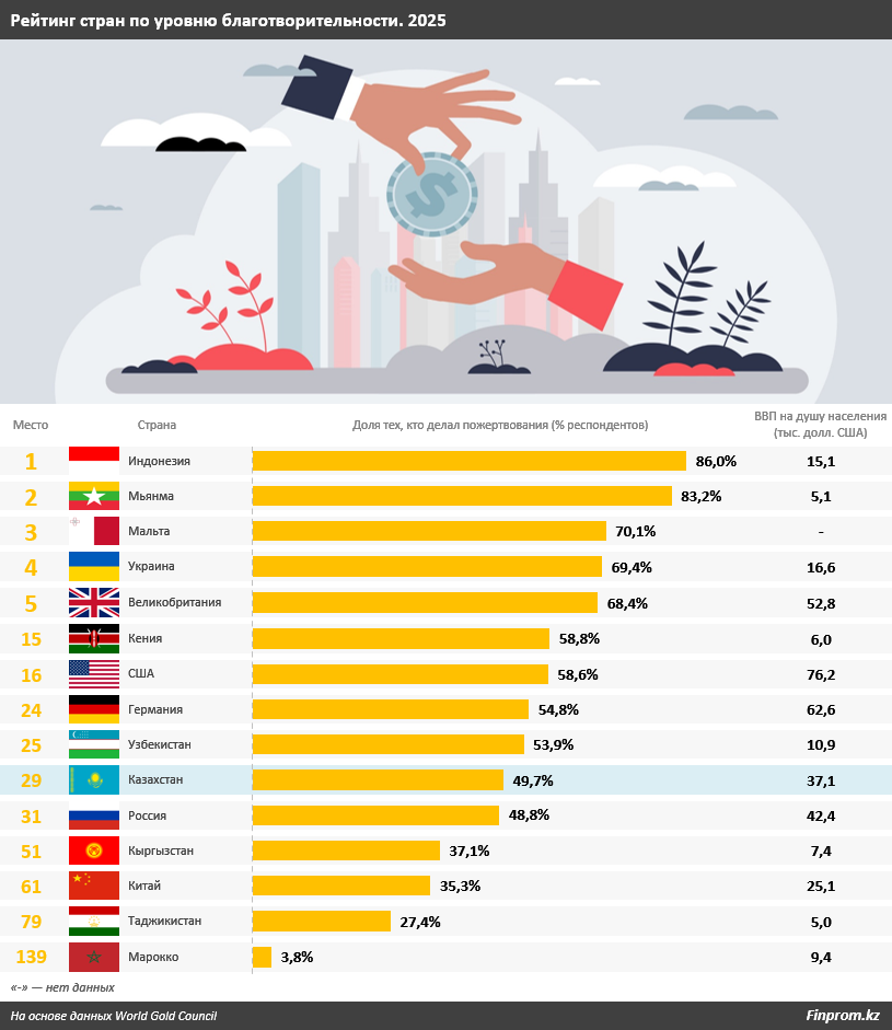 В рейтинге стран по благотворительности Узбекистан опередил Россию и Казахстан, но уступил Мьянме, Мальте  и Кении