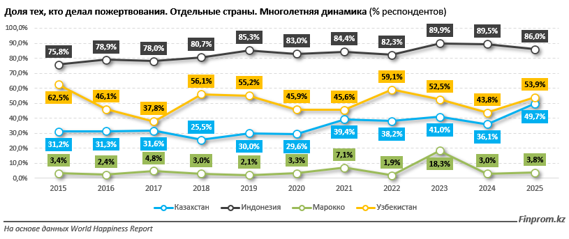 В Узбекистане динамика доли тех, кто делал пожертвования, с 2015 по 2025 год была зигзагообразной. Удельный вес благотворителей периодически то уменьшался, опускаясь до минимальной отметки в 37,8%, то вырастал, превышая 55%.