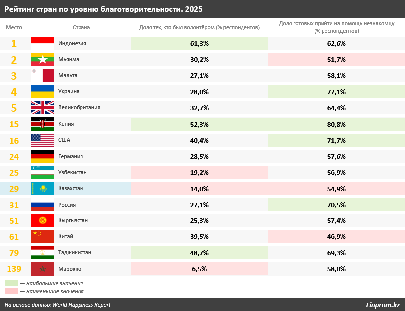 Ранжирование стран было проведено по наибольшей доле респондентов, делавших пожертвования в последний месяц перед опросом. В лидерах оказались отнюдь не самые богатые государства мира. Первые два места заняли страны с далеко не самым высоким уровнем благосостояния граждан — Индонезия и Мьянма. В крупнейшем в мире островном государстве оказалось больше всего благотворителей: 86% респондентов. В Мьянме доля жертвовавших деньги составила 83,2%.