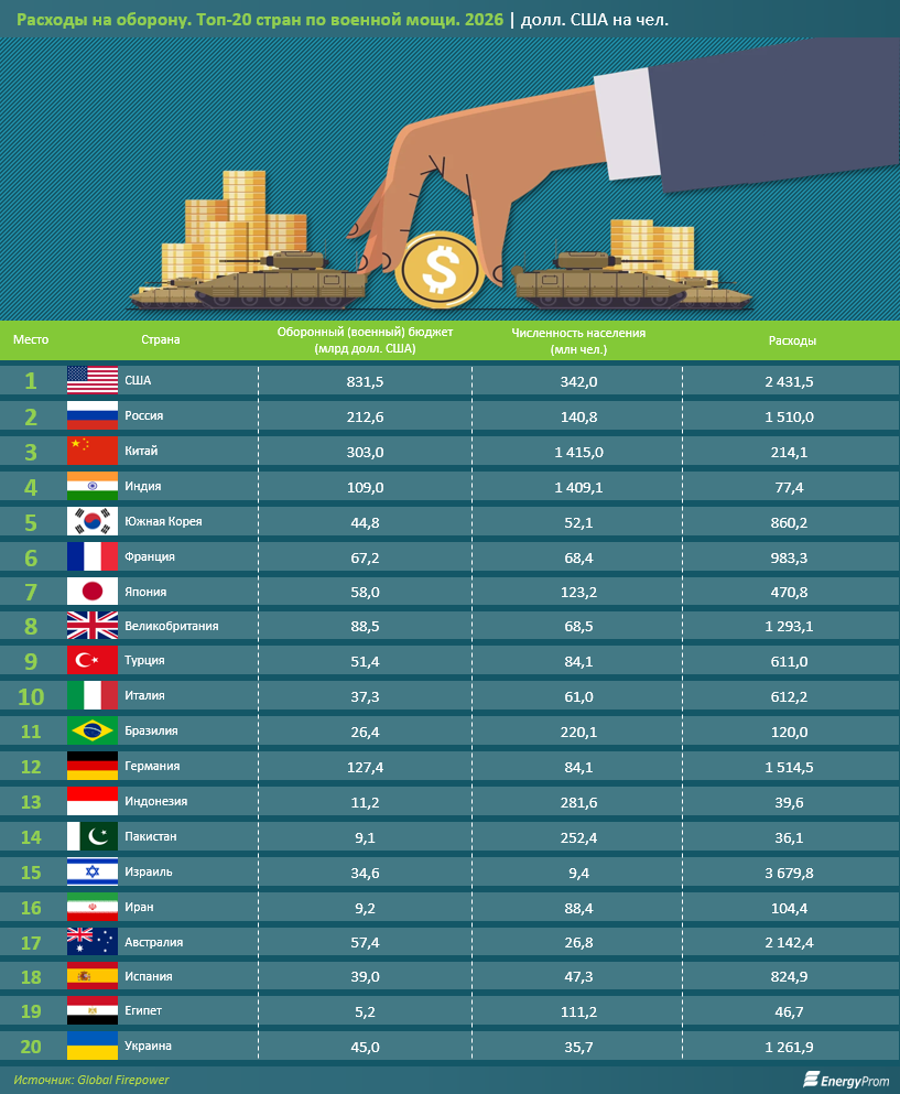Среди 20 ведущих военных держав мира по индексу Global Firepower 2026 наибольшие расходы на душу населения зафиксированы у Израиля: 3,7 тыс. долл. США на человека в год. При сравнительно небольшом населении (9,4 млн человек) и военном бюджете в 34,6 млрд долл. США страна выходит на первое место с заметным отрывом. На втором месте располагаются США (2,4 тыс. долл. США на человека) при общем военном бюджете в 831,5 млрд долл. США — крупнейшем в абсолютном выражении. Третью строчку занимает Австралия (2,1 тыс. долл. США на человека), что нередко остаётся вне поля зрения в дискуссиях о военных расходах.