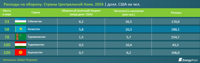 В странах Центральной Азии уровень оборонных расходов на душу населения значительно ниже, чем в большинстве государств первой двадцатки. Казахстан лидирует в регионе с показателем в 288,1 долл. США на человека, опережая Туркменистан (254,7 долл. США) и Узбекистан (170 долл. США). Кыргызстан и Таджикистан заметно отстают: 106 и 43,3 долл. США соответственно.