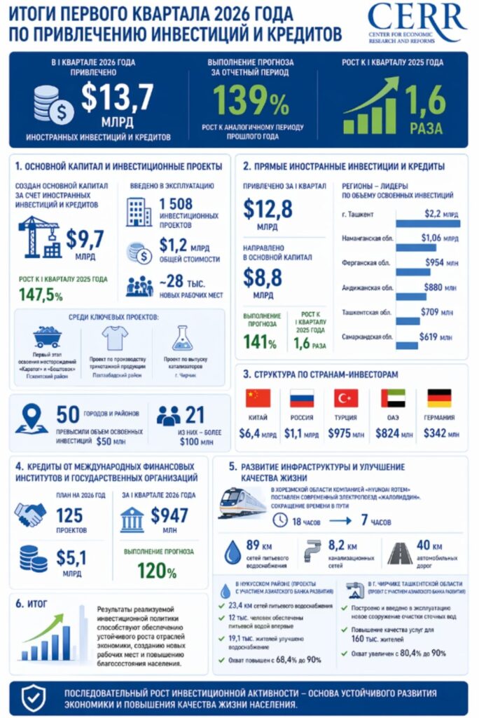 Итоги первого квартала Инвестиционной программы на 2026 год показывают последовательный рост инвестиционной активности в стране. На текущий год поставлена цель привлечь в экономику республики в общей сложности $53 млрд иностранных инвестиций и кредитов.