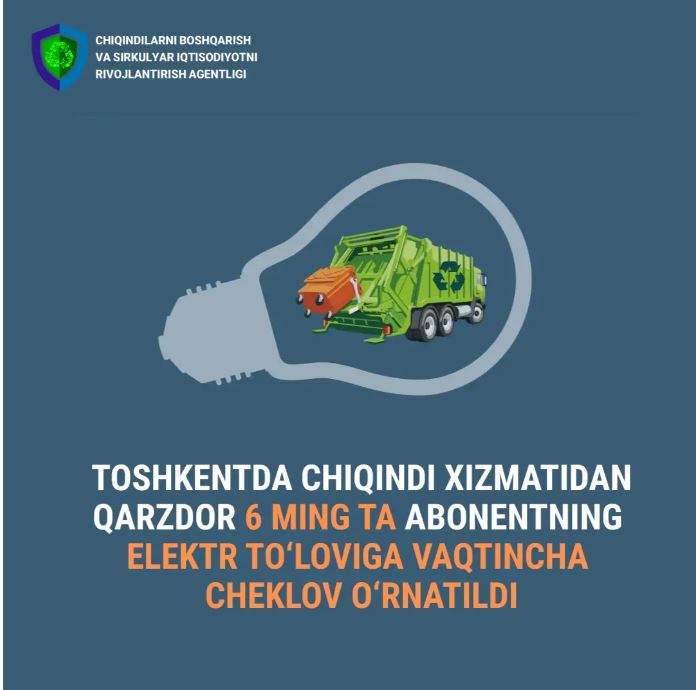 Как известно, в соответствии с Законом Республики Узбекистан №1044 от 7 марта 2025 года «О внесении дополнений и изменений в отдельные законодательные акты Республики Узбекистан, направленных на укрепление платёжной дисциплины в сфере оказания услуг по сбору и вывозу отходов», введён новый порядок, направленный на усиление платёжной дисциплины за услуги по сбору и вывозу отходов. Согласно установленному порядку, до 3-го числа каждого месяца информация о должниках передаётся из электронной биллинговой системы «Toza makon» Агентства по управлению отходами и развитию циркулярной экономики в биллинговую систему АО «Региональные электрические сети».