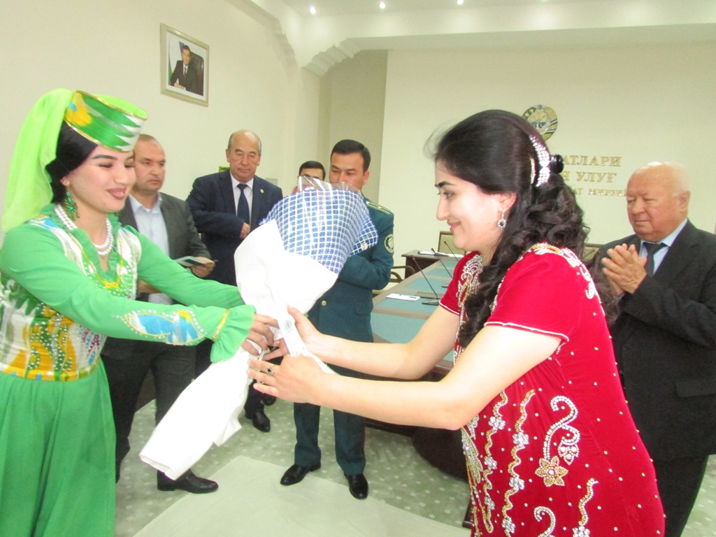 Зал празднично украшен. Раздаются до боли знакомые мелодии страны. Девушки в национальных костюмах плавно выходят в центр зала и исполняют узбекский народный танец. Это девушки из хореографического ансамбля «Марварид»(Жемчужина).