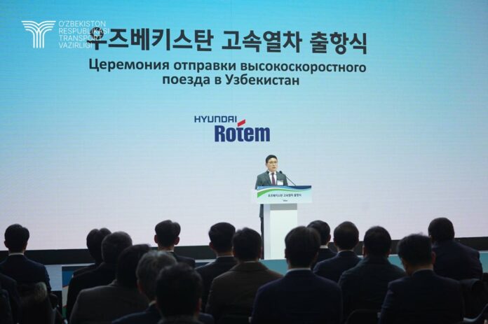 В порту Масан города Чангвон, Южная Корея, состоялась официальная церемония отправки первой партии высокоскоростных поездов Hyundai Rotem, произведенных для Узбекистана.