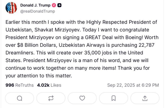 Президент США Дональд Трамп поздравил Шавката Мирзиёева с подписанием соглашения о покупке Uzbekistan Airways 22 самолетов Boeing 787 Dreamliner на сумму свыше 8 миллиардов долларов.
