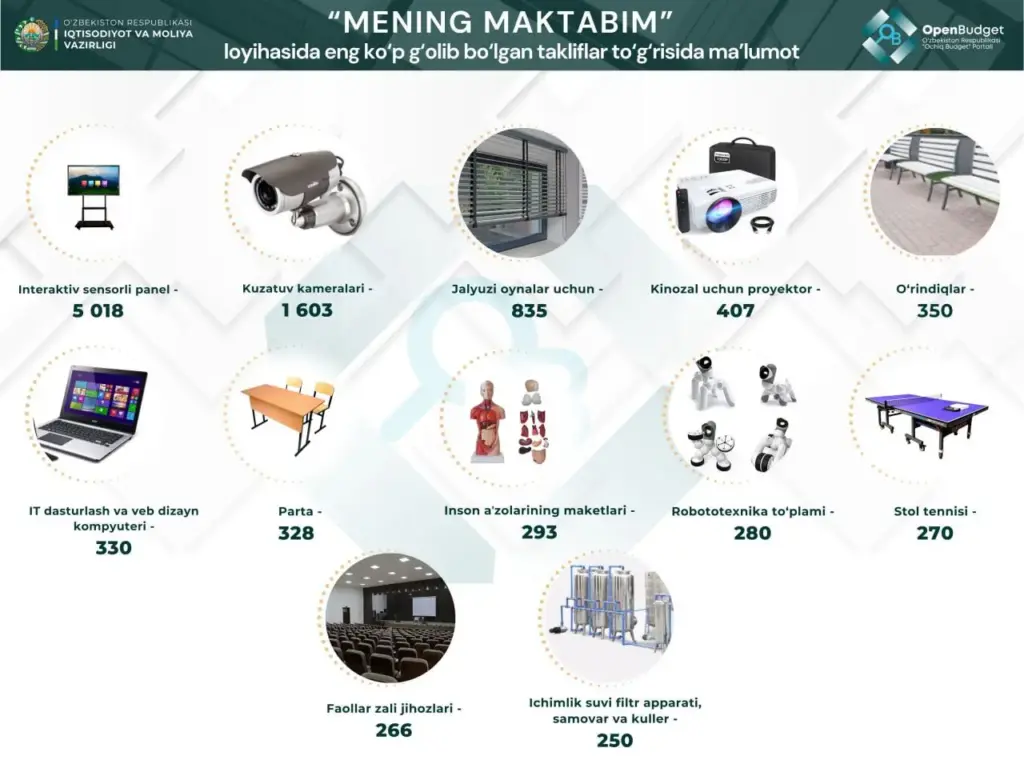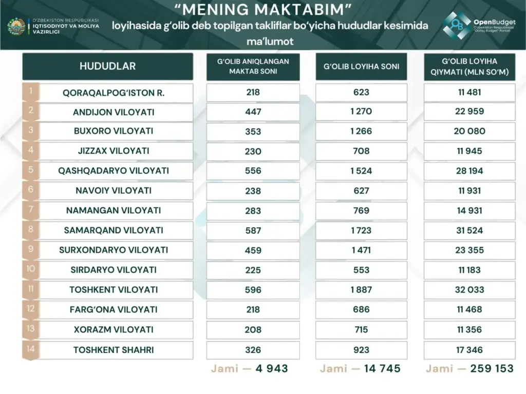 “Open Budget” порталида “Mening maktabim” лойиҳасининг 2025/2026-ўқув йили учун биринчи босқич ғолиблари эълон қилинди. Унга кўра, умумий қиймати 259 млрд 153 млн сўм бўлган 14 745 та лойиҳа ғолиб деб топилди.