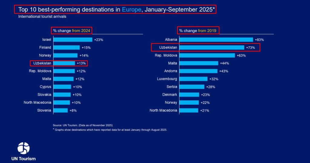 Mazkur natijalar Yevropa mintaqasi doirasida ham O‘zbekiston turizmiga berilayotgan ijobiy baholarning yaqqol ifodasi bo‘ldi. BMT Turizm reytingiga muvofiq, 2019-yilga nisbatan turistlar sonining o‘sish sur’atlari bo‘yicha O‘zbekiston Yevropa mintaqasining eng yaxshi natija qayd etgan davlatlari qatoridan 2-o‘rinni oldi. 2025-yilning dastlabki to‘qqiz oyida O‘zbekistonga kelgan xalqaro turistlar soni 2024-yilga nisbatan 13 foizga oshdi, natijada mamlakat Yevropa mintaqasida eng yuqori o‘sish qayd etgan TOP–4 turistik yo‘nalishlar qatoriga kiritildi.