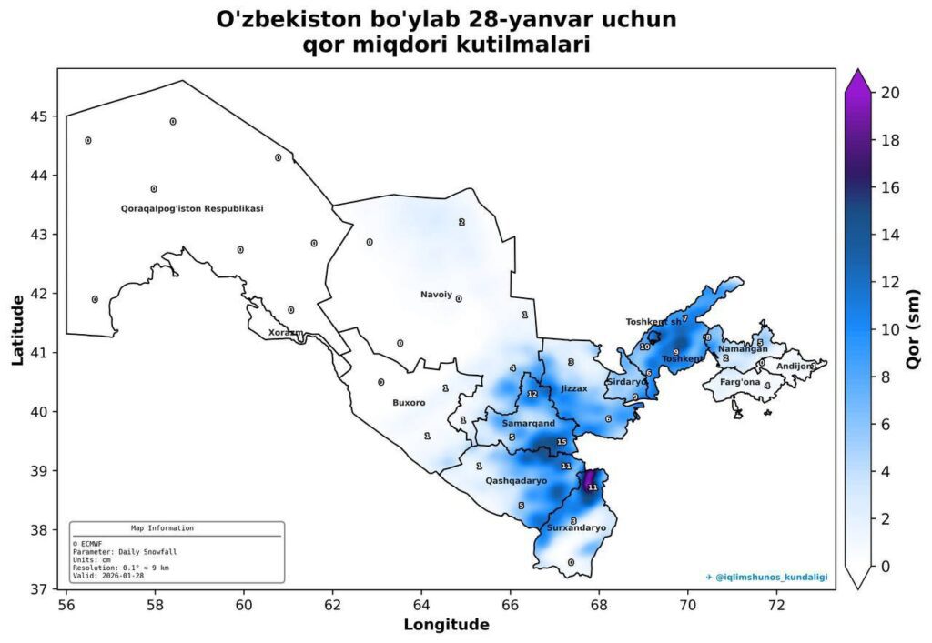 Бугун (28 январ) айрим худудларда ёғингарчилик ва ёмғир қорга айланиши кутилмоқда
